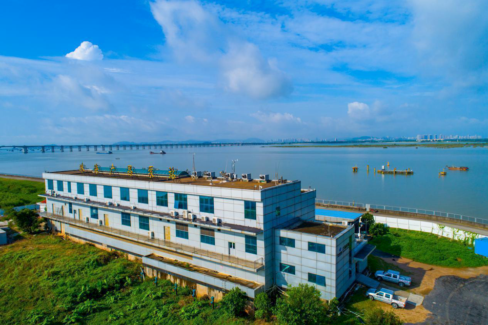 廣昌泵站位于西江磨刀門水道珠海大橋上游,占地面積71畝,共有一、二期兩座泵房,泵站采用河心式取水方式,總取水能力230萬立方米/日。每年豐水期(汛期)廣昌泵站是珠海東部以及澳門的主力取水泵站,而枯水期(咸期)則主要作為珠海原水供應系統(tǒng)中“西水東調(diào)來水”(上游平崗泵站、竹洲頭泵站或竹銀水庫來水)的中途轉輸水泵站,是珠海和澳門原水供應系統(tǒng)中重要的樞紐泵站。
