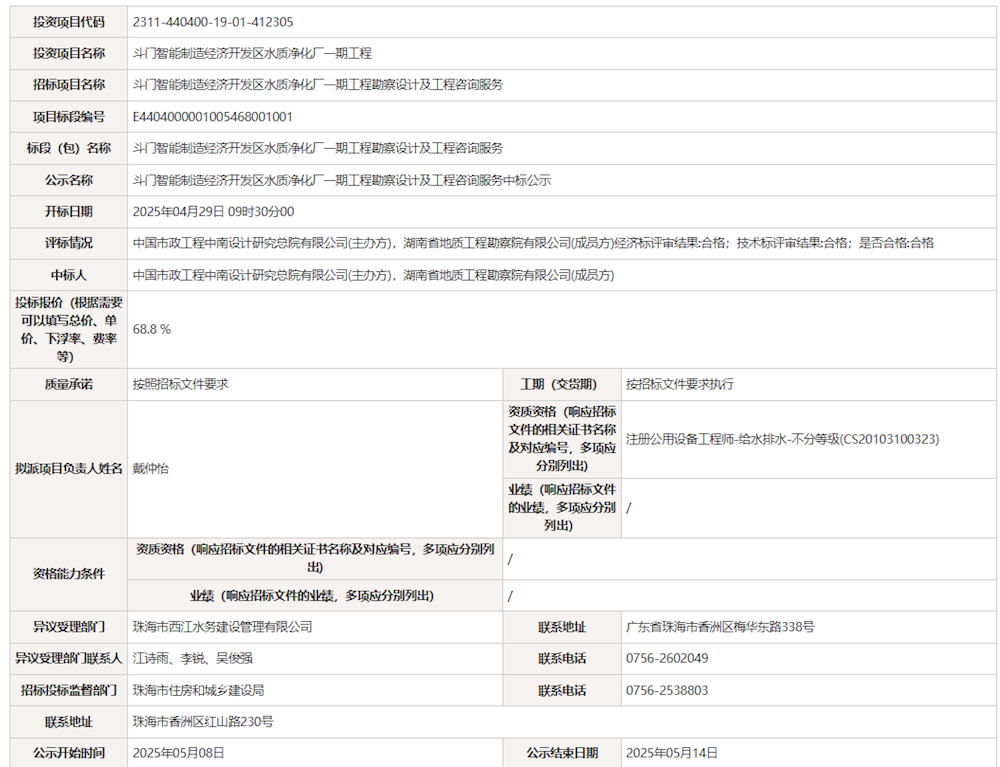 斗門(mén)智能制造經(jīng)濟(jì)開(kāi)發(fā)區(qū)水質(zhì)凈化廠一期工程勘察設(shè)計(jì)及工程咨詢服務(wù)中標(biāo)公示
